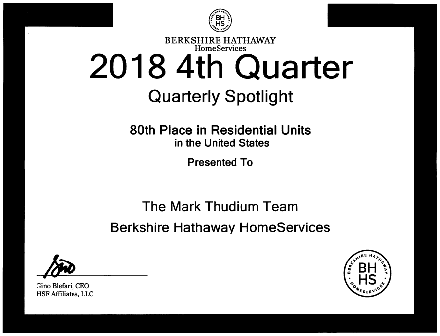Every quarter Berkshire Hathaway HomeServices sends out a list of the top real estate teams from around the United States. We are proud to announce that our Team is a Top 100 Team, again! In the Fourth Quarter of 2018 our team ranked as the top 80th Team in the United States for Residential Units! Many thanks to all of our clients for helping us to achieve this goal!